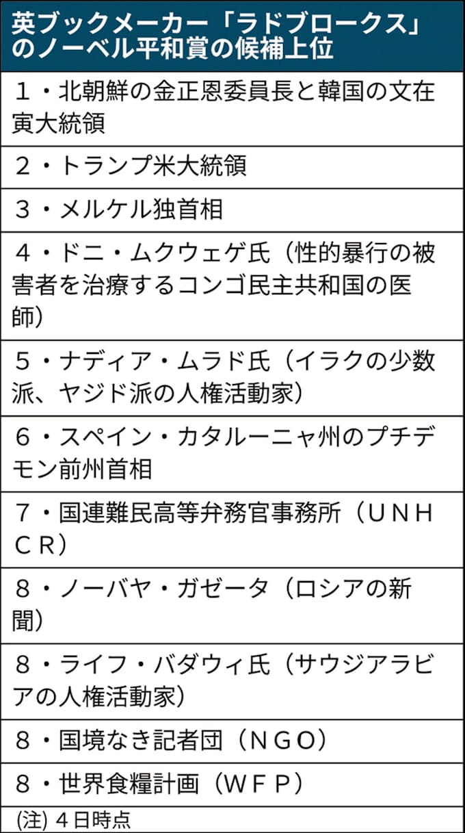 ノーベル平和賞 賭け屋人気は南北首脳とトランプ氏 日本経済新聞